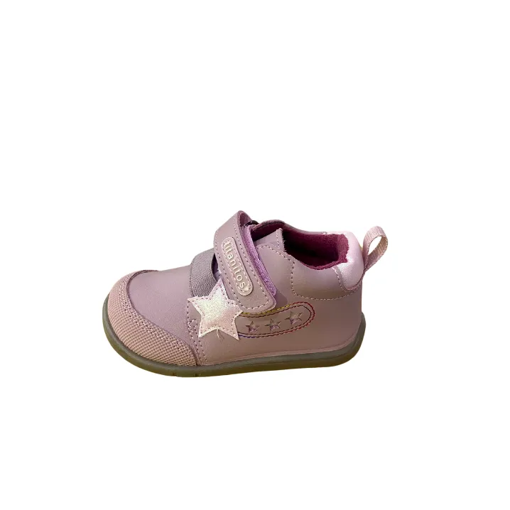 Bota barefoot rosa com detalhe de estrela na lateral. Fecho com elástico e velcro. Drop 0 Biqueira reforçada. Palmilha removível Sola de borracha antiderrapante.