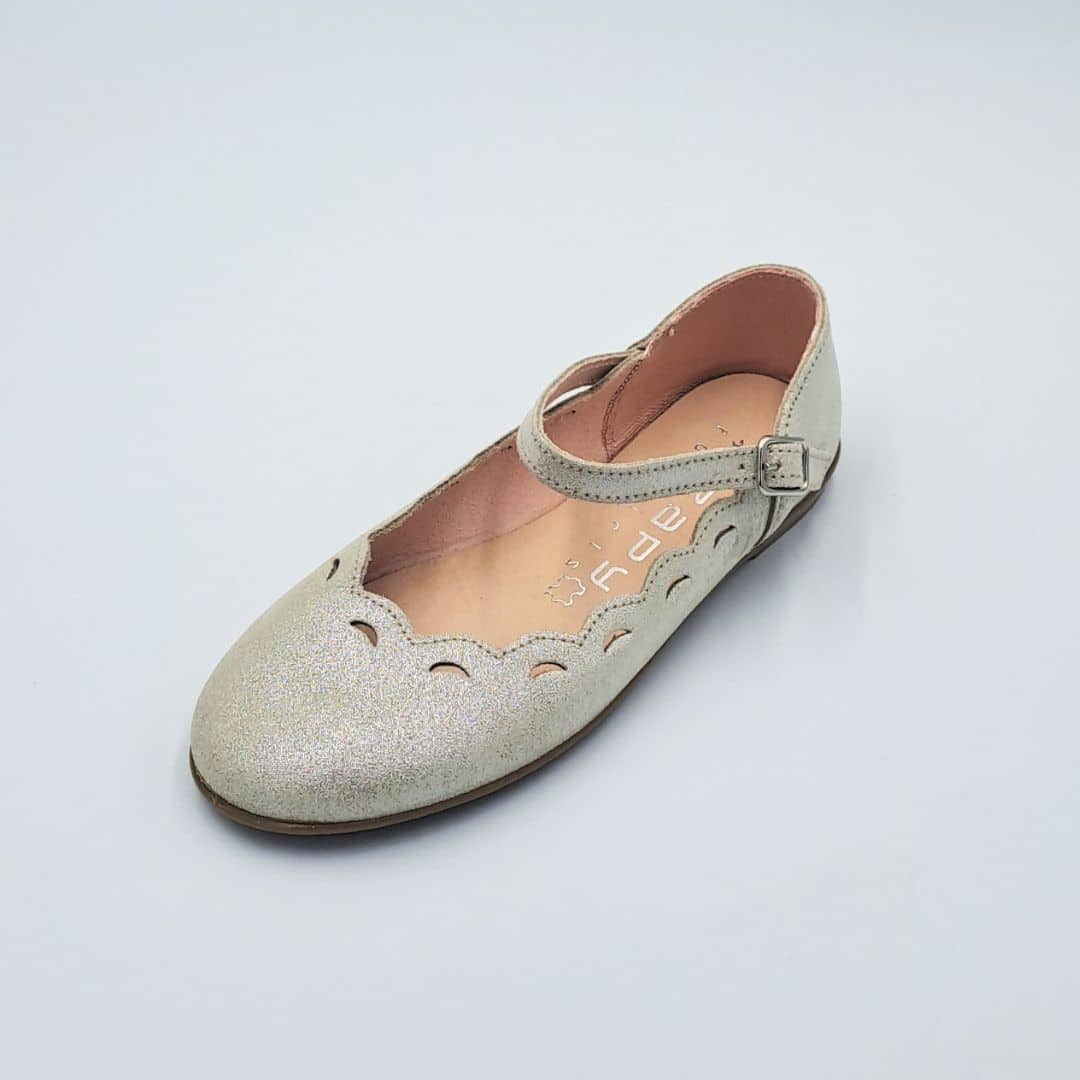 Mary Janes bege nacarado para menina, com folhos e fecho de tira e fivela.