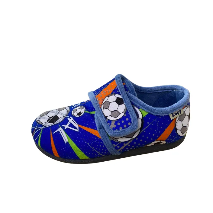 pantufa fechado. Azul com estampado de futebol. Fecho em velcro. Tamanhos: 28 ao 34