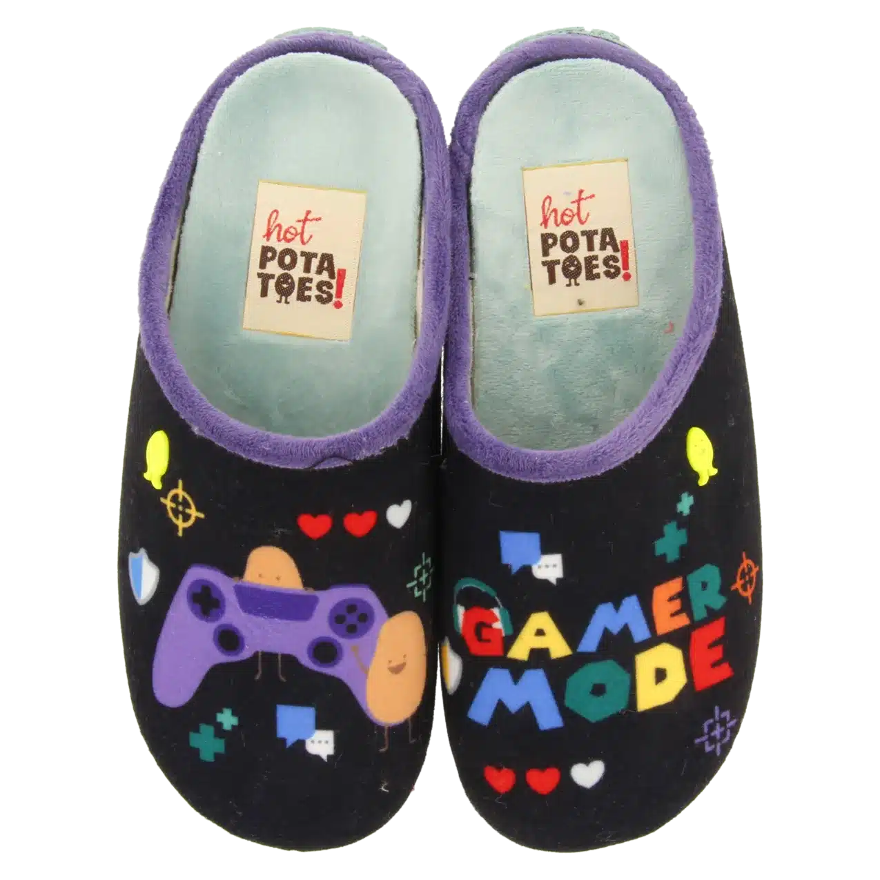 Pantufa preto com estampado de videojogos e a mensagem “Modo Gamer”.