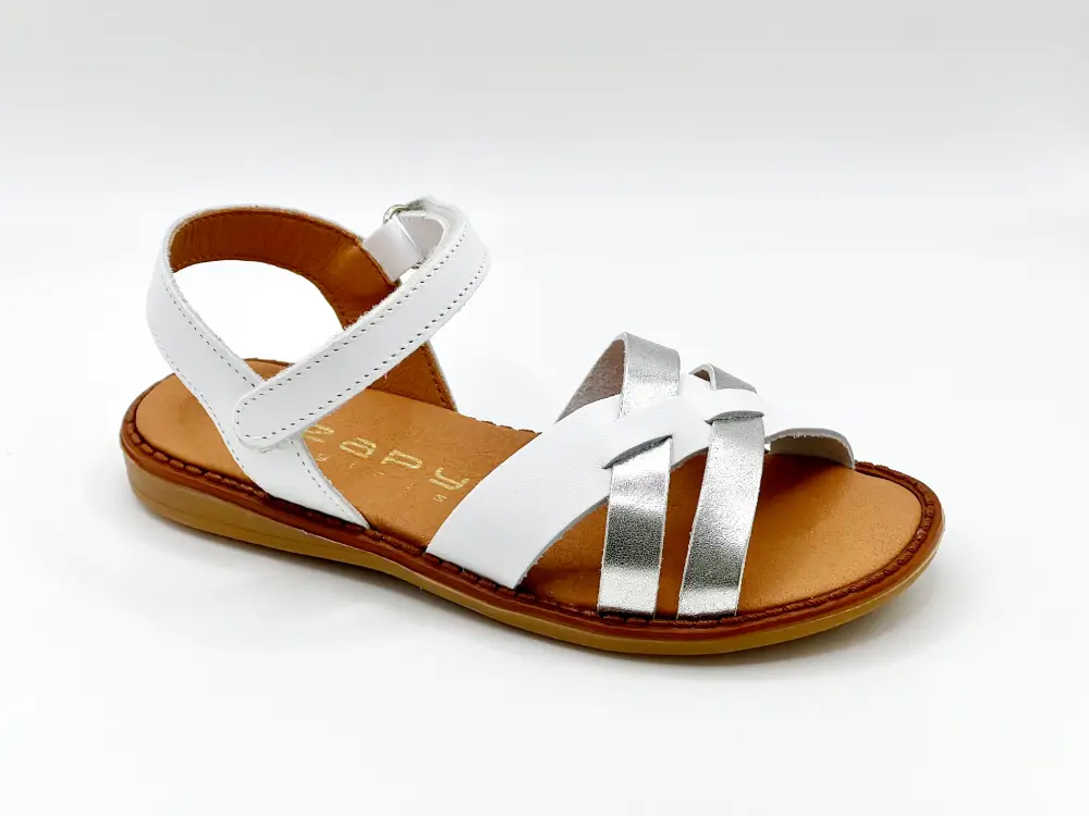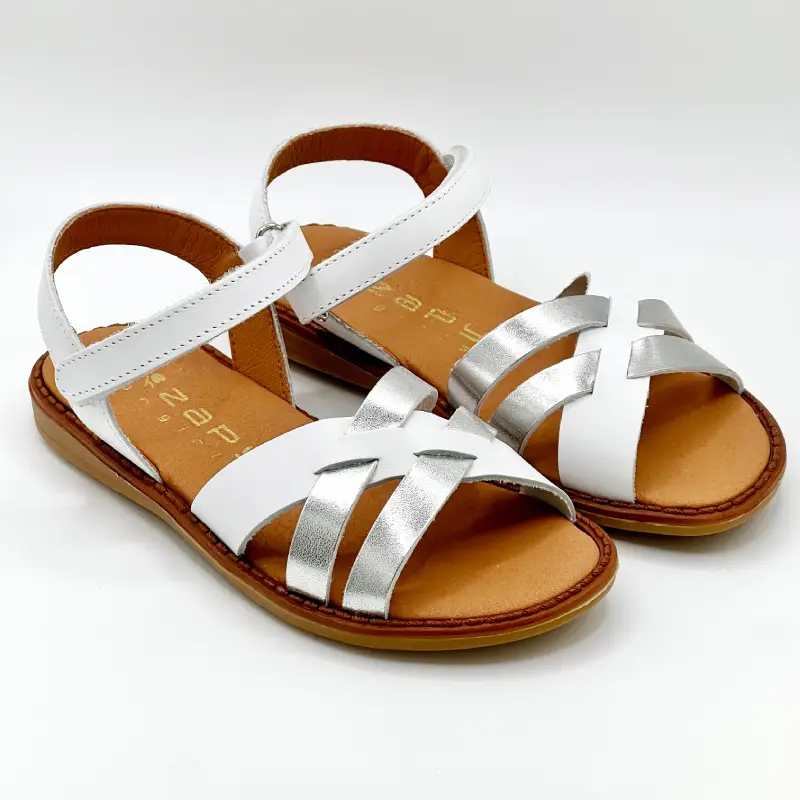 Sandálias em pele branca com tiras prateadas. Fecho em velcro para maior sustentação. Palmilha acolchoada e sola de borracha.