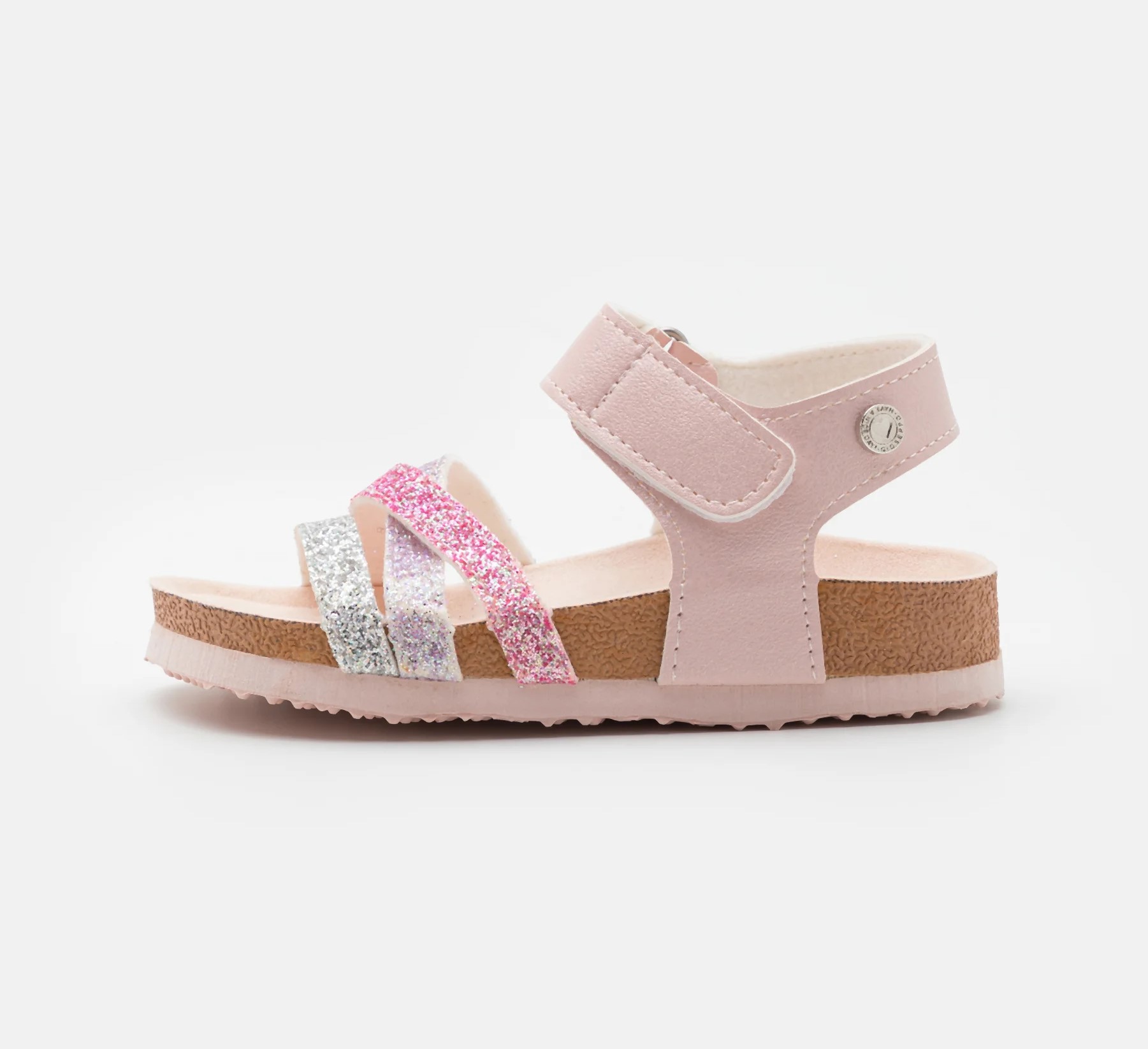 Tiras cruzadas numa combinação de cinzento, lilás e rosa com glitter.
