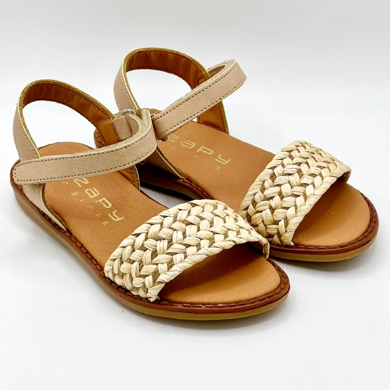 Sandália feminina elegante com cabedal em ráfia bege e camelo.