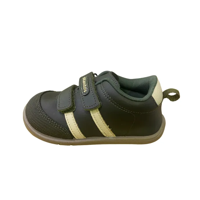 Ténis barefoot em cor caqui, com duas riscas. Drop 0 Sem contraforte. Sola de borracha antiderrapante. Fecho com elástico e velcro. Palmilha removível.